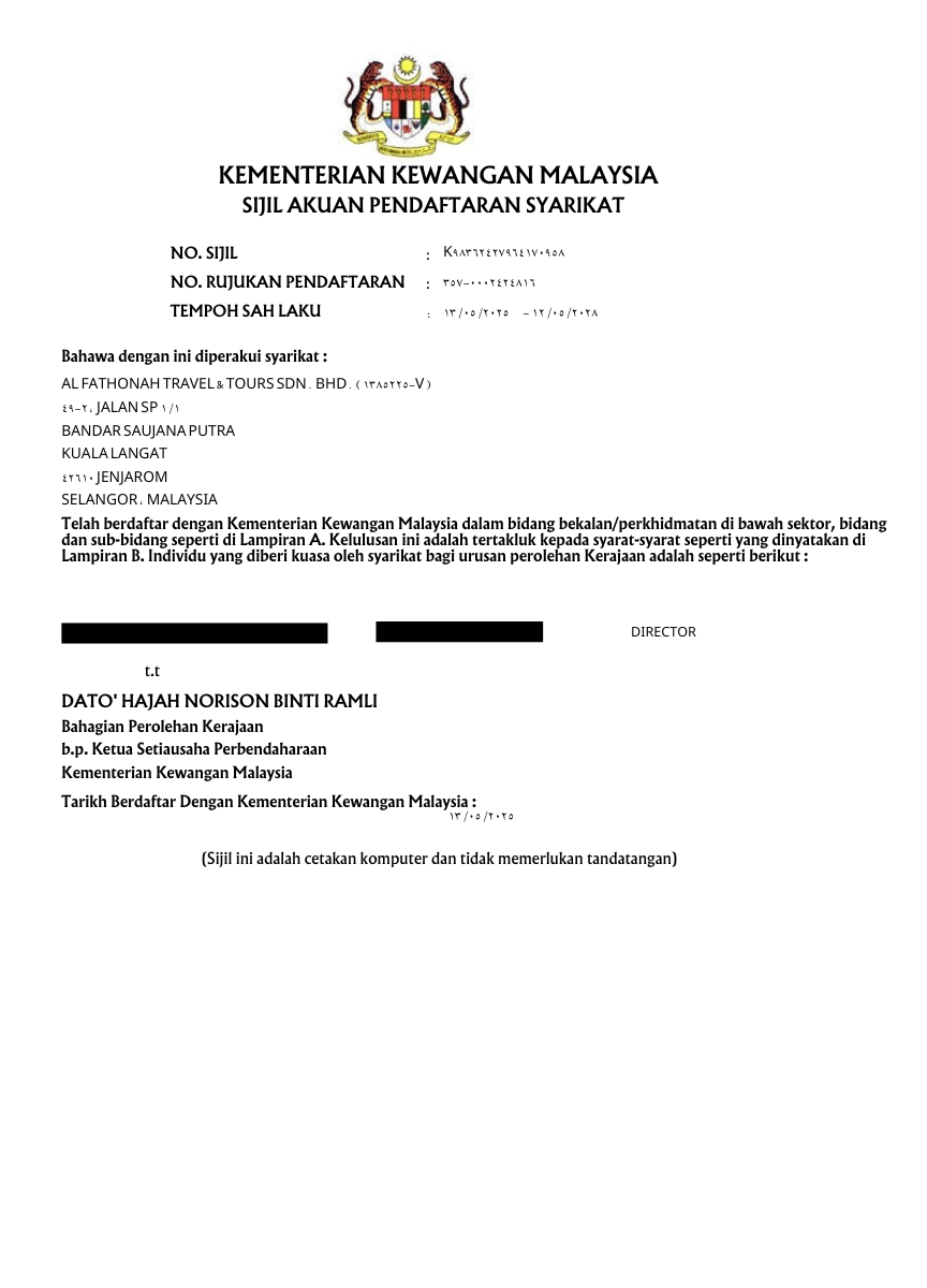 Al Fathonah Travel & Tours Sdn Bhd merupakan syarikat yang diperakui oleh Kementerian Pelancongan, Seni dan Budaya MOTAC, Sijil Pematuhan Cukai dari LHDN serta Sijil Akuan dari Kementerian Kewangan Malaysia MOF.